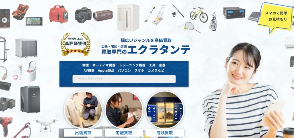 | エクラタンテ | 出張・宅配・店頭買取を手掛ける買取業者。幅広いジャンルを取り扱っています。 出張費・査定費など各種手数料が無料という特徴あり。 |