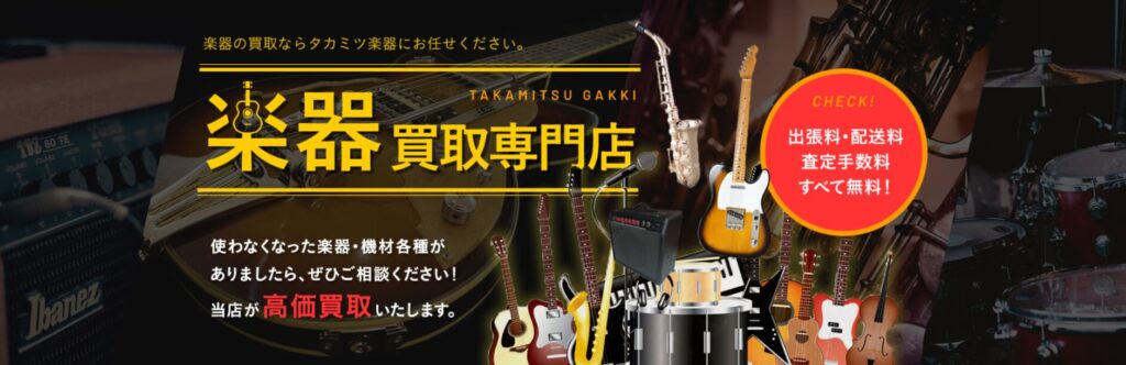 | タカミツ楽器 | 楽器買取専門店で、ギター、ベース、ウクレレなどのポピュラー系弦楽器を幅広く取り扱う。 店頭・宅配・出張買取に対応し、特に東海エリアでの実績が豊富です。 |