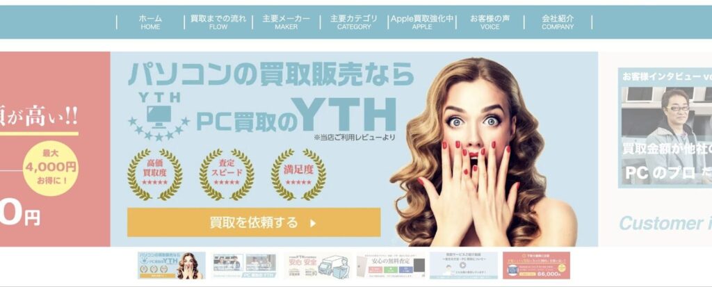 PC買取のYTHは宅配買取専門の買取業者で、壊れたパソコンの買取にも対応するなど、買取不可製品の特別な条件がないことが特徴です。
