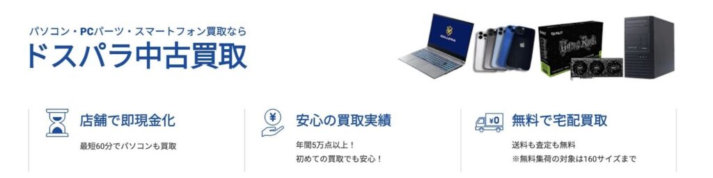 ドスパラは、パソコンだけでなく周辺機器やグラフィックボード、CPUといったPCパーツなども買取り可能な業者です。