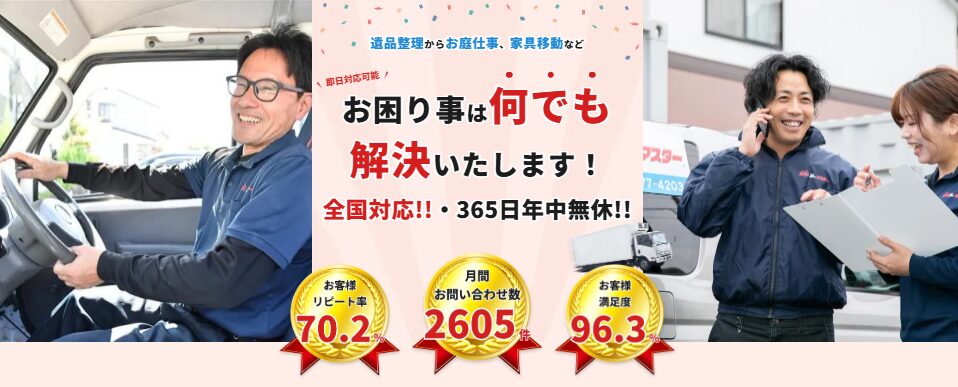便利屋お助けマスター全国本部 全国対応の便利屋チェーンで、遺品整理や引越し手伝い、ゴミ屋敷片付けなど幅広く対応。 年中無休で即日対応、見積も…
