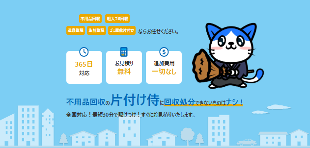 片付け侍は、不用品回収や粗大ゴミの処分、遺品整理、ゴミ屋敷の片付けなどを全国対応で行う清掃サービス業者です。